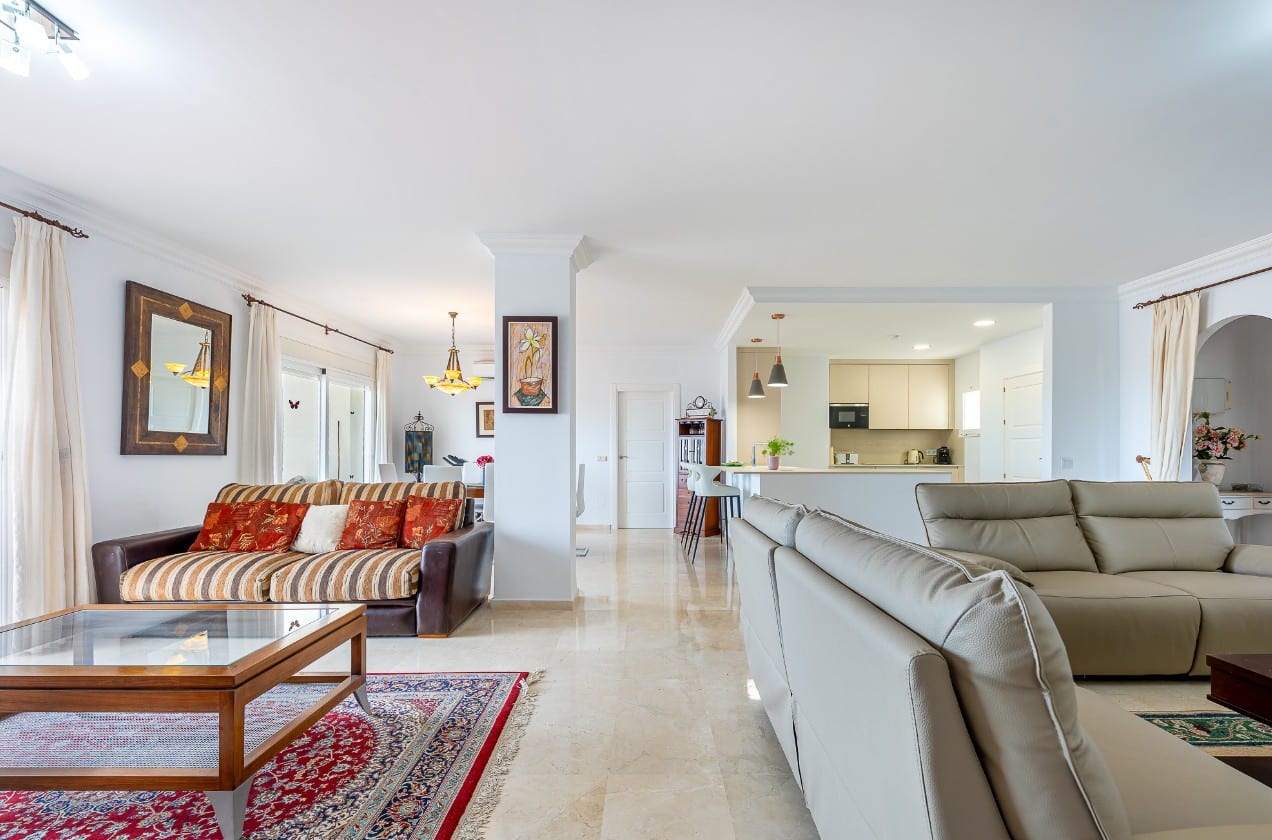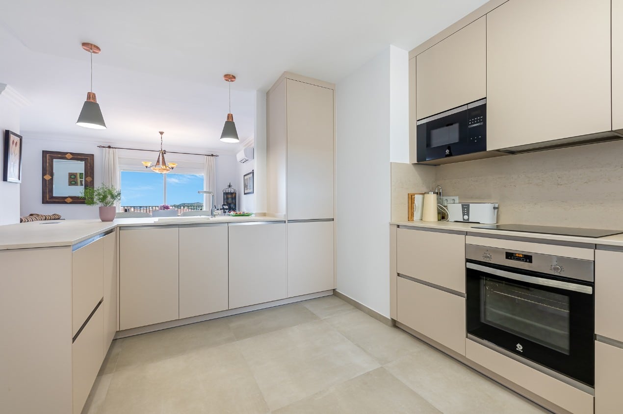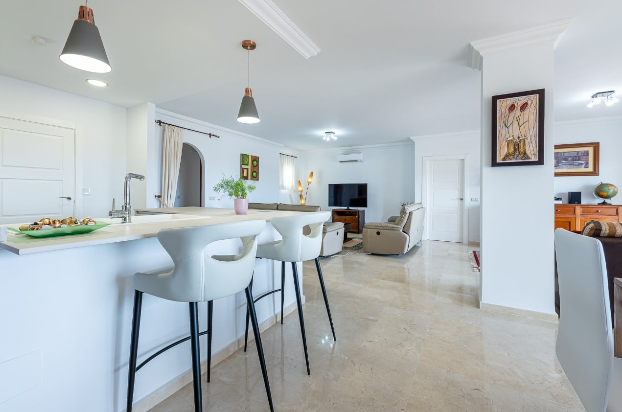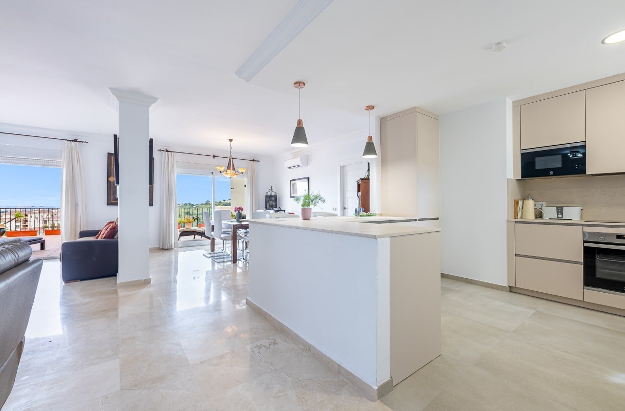 The extraordinary American kitchen open to the living room and this in turn open to the large terrace, gives the main space of the accommodation an incredible spaciousness and luminosity where you can enjoy the always spectacular sunlight in Mijas.