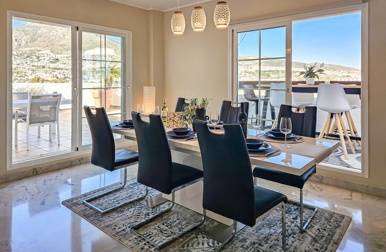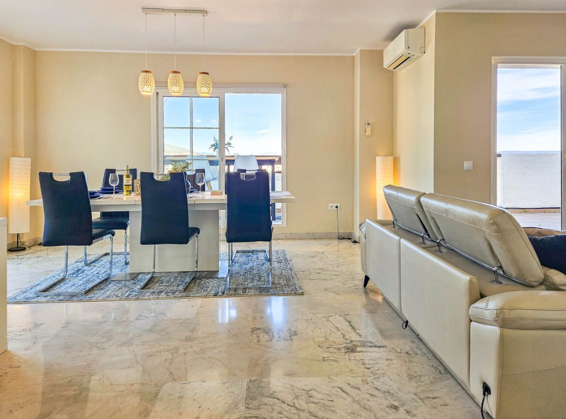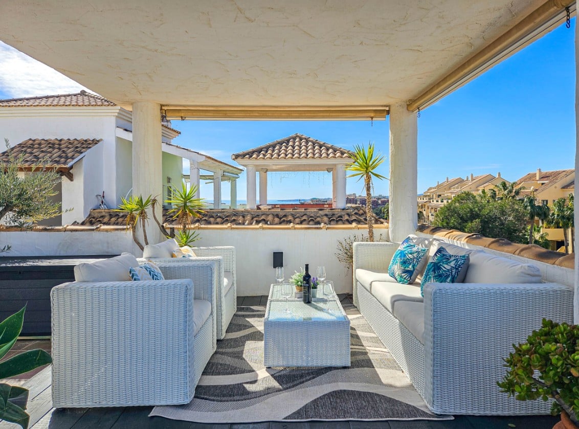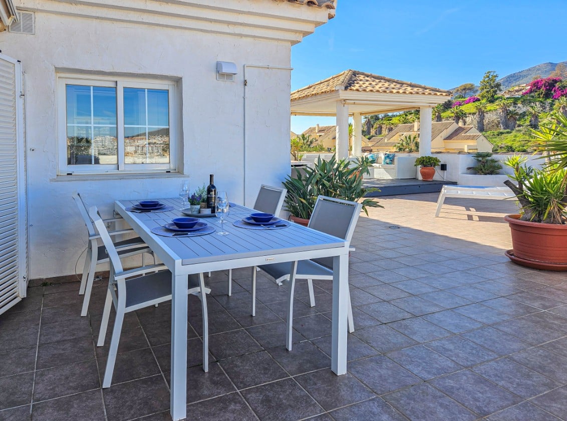 This homely apartment offers a wrap around terrace that offers stunning sea and mountain views. A lounge seating area under the pergola can be enjoyed, along with the dining seating area and sun loungers. The outdoor kitchen area offers a gas BBQ, a countertop and fridge. There is also a covered terrace furnished with a high dining table and stools. Fitted with glass curtains, this terrace is perfect for the summer and winter months.