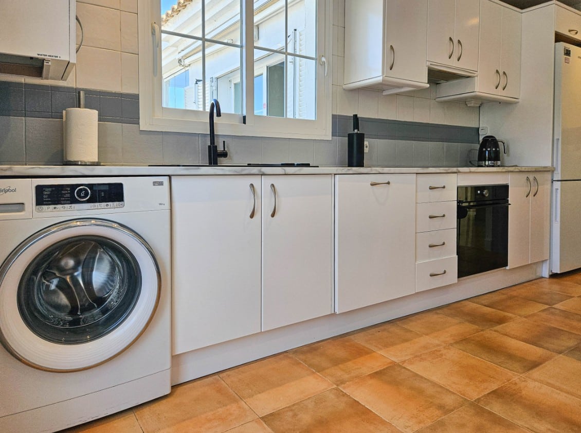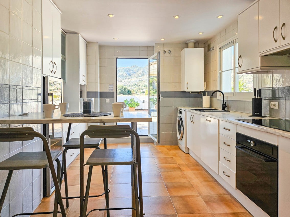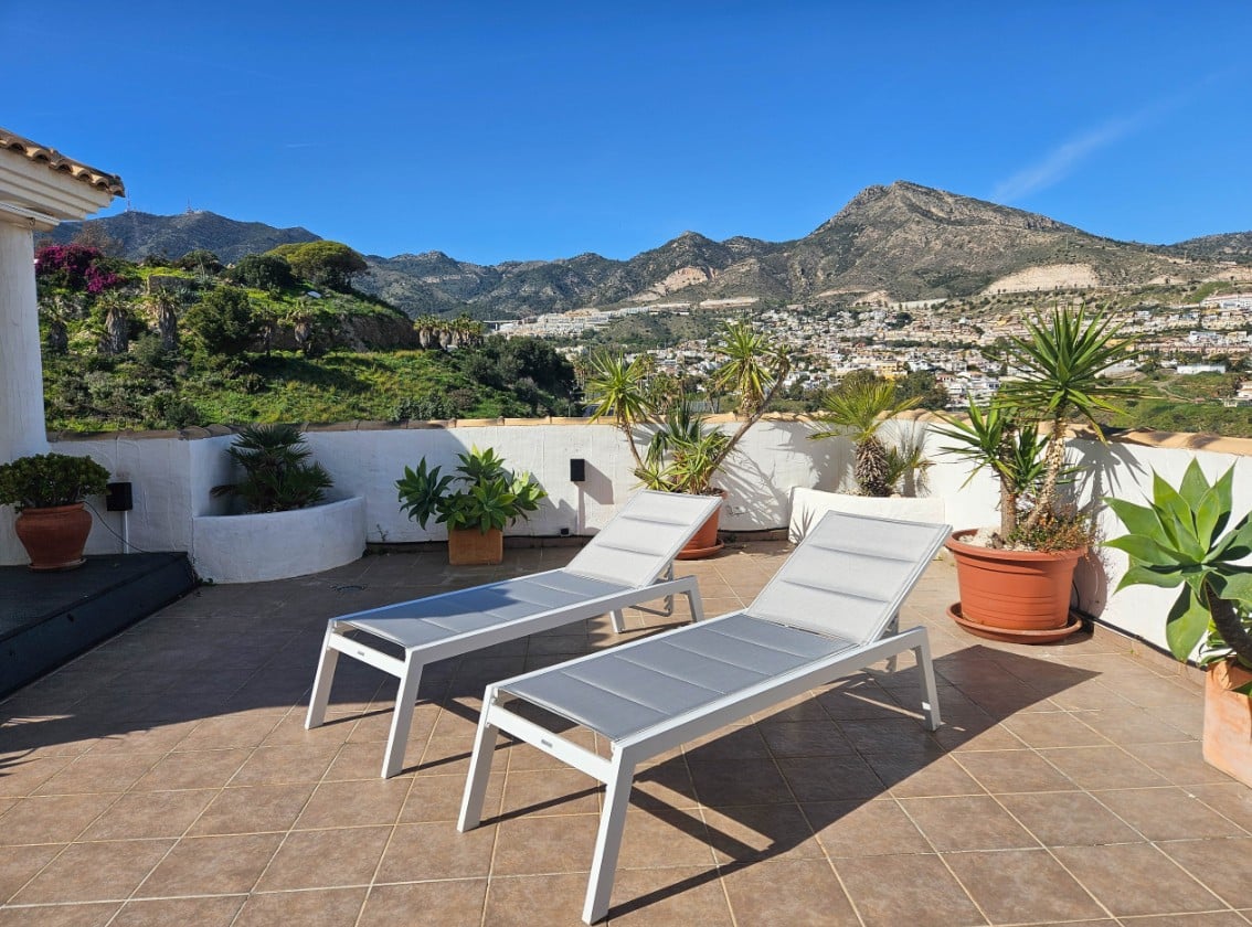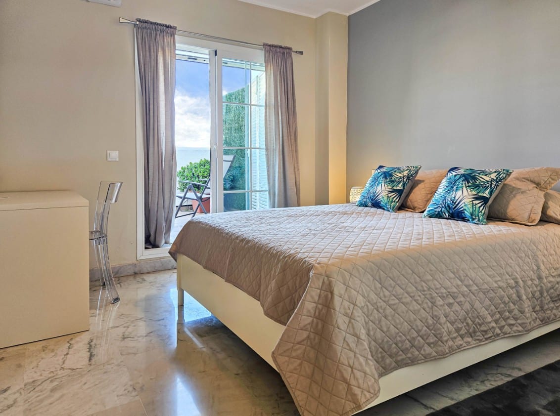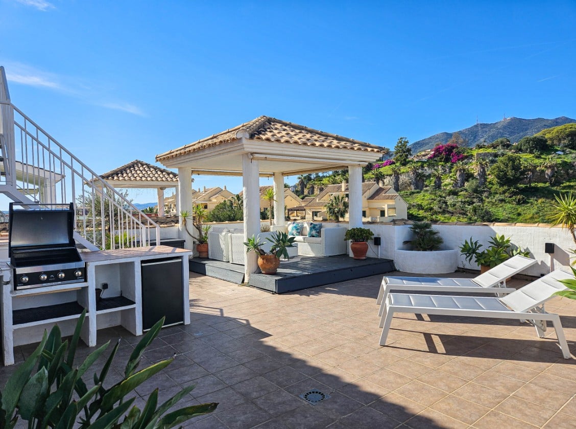 This homely apartment offers a wrap around terrace that offers stunning sea and mountain views. A lounge seating area under the pergola can be enjoyed, along with the dining seating area and sun loungers. The outdoor kitchen area offers a gas BBQ, a countertop and fridge. There is also a covered terrace furnished with a high dining table and stools. Fitted with glass curtains, this terrace is perfect for the summer and winter months.