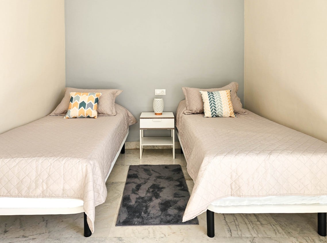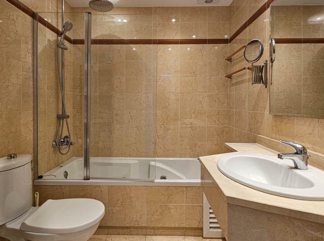 The master bedroom benefits from a king size bed, fitted wardrobes and has an ensuite bathroom. The master bedroom has access onto the terrace that is also shared with the lounge. The first guest bedroom is furnished with a king size bed and fitted wardrobes. The second guest bedroom offers twin beds and fitted wardrobes. The guest bedrooms share access to a small private terrace and the guest shower room.