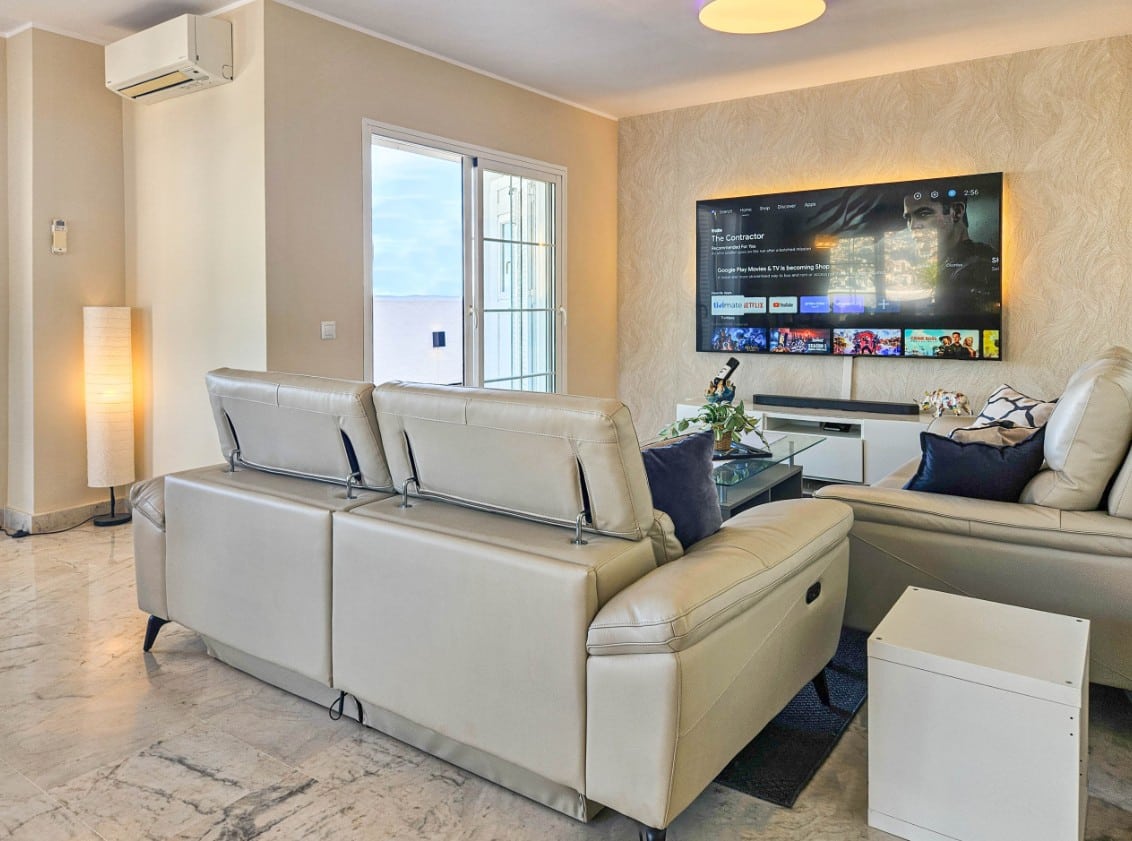 This tastefully furnished apartment is located on the second floor, with access by lift and is arranged over one level. The open plan living space consists of a spacious lounge/dining area furnished with two sofas, one with electric reclining seats, an 85″ smart TV with international channels and a dining table with six chairs. From here you can access all terraces. The separate, spacious kitchen is well equipped and give access to the main terrace.