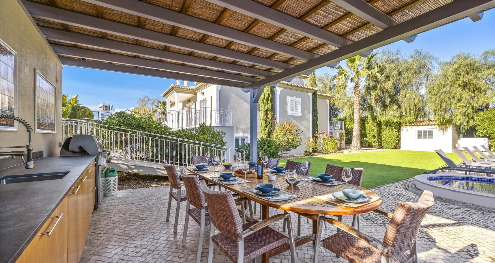- Covered terrace with shaded seating and a coffee set for slow mornings