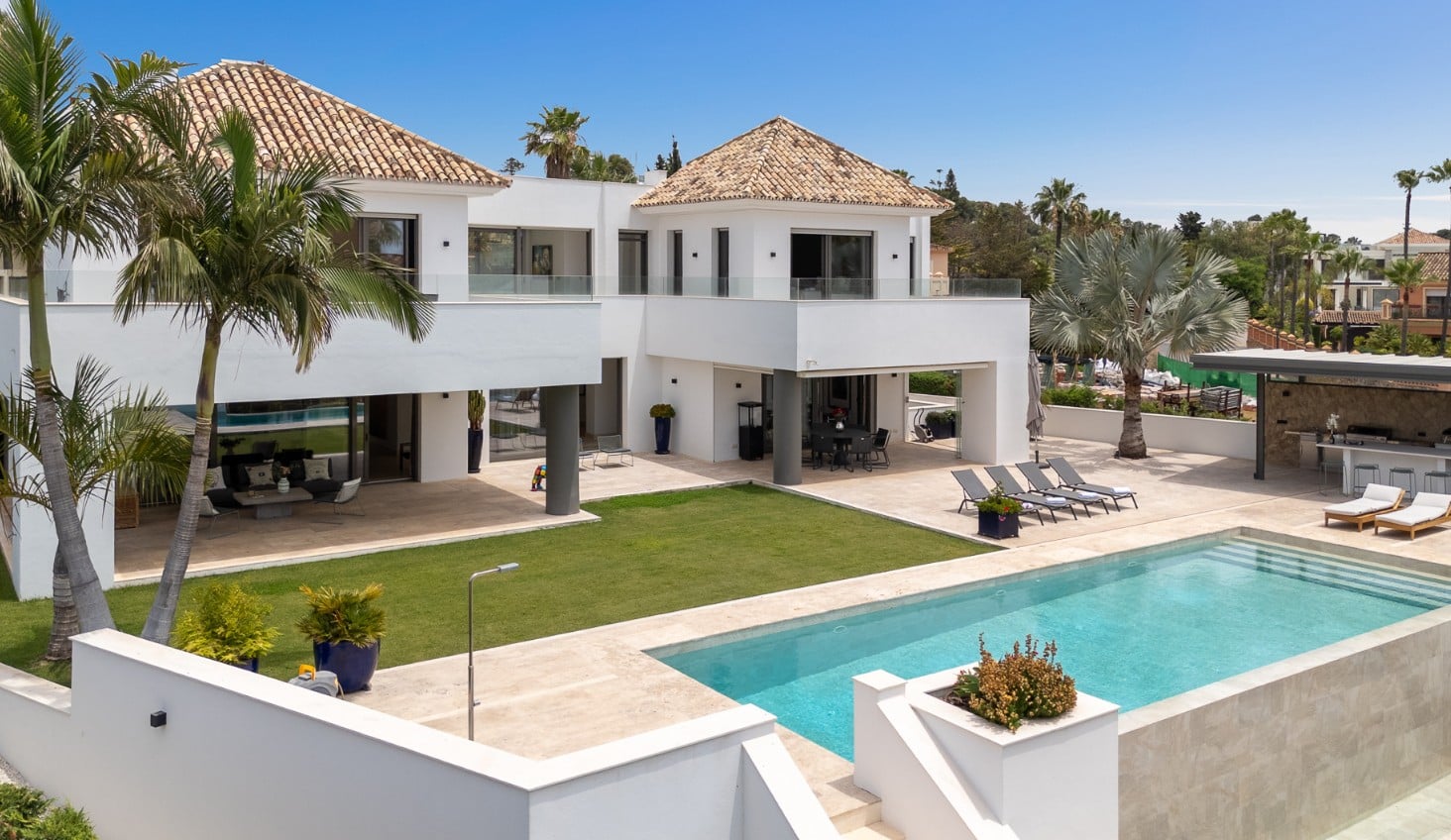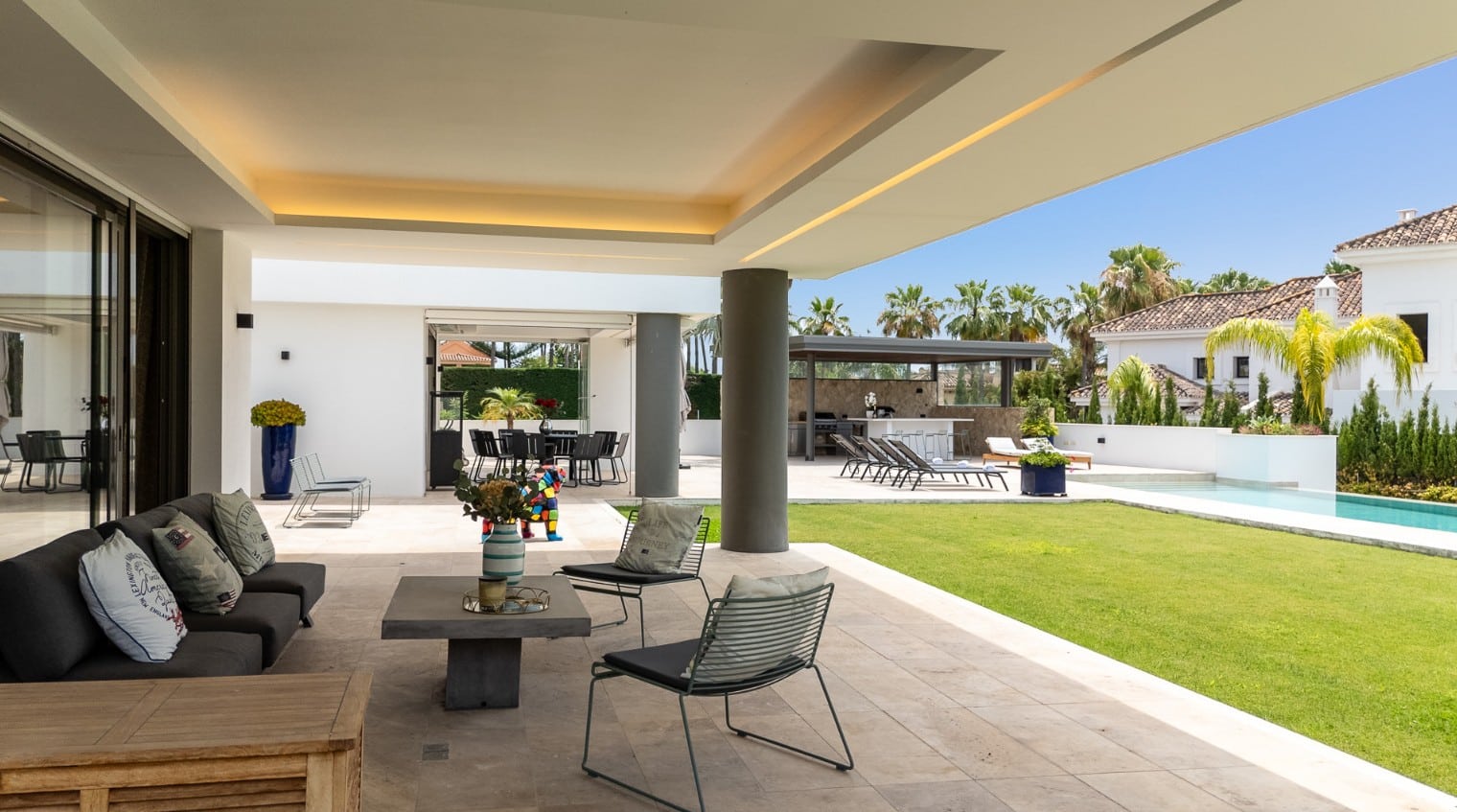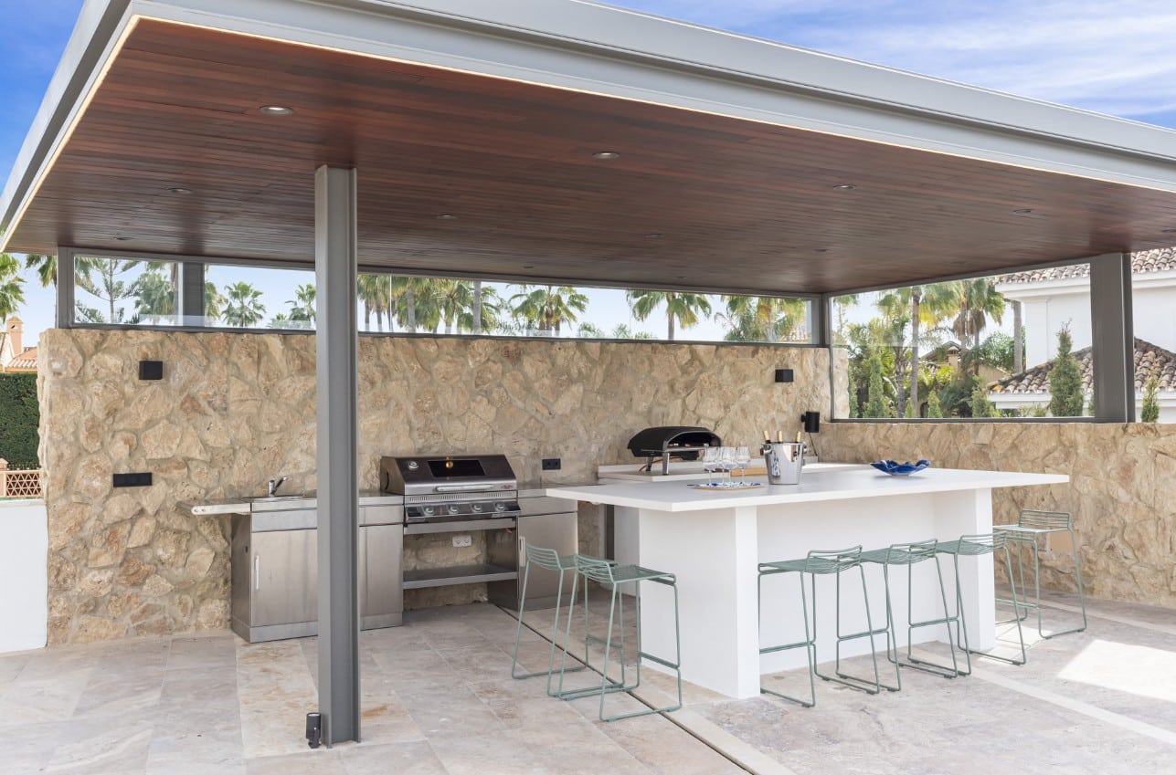 Outside, the villa’s garden is a true highlight. The overflow infinity pool creates a beautiful, tranquil setting where you can cool off or relax by the water with a good book. A fantastic new outdoor kitchen and BBQ area is being constructed, paired with a seating area—perfect for hosting meals with family or friends. At night, the villa comes alive with light projections that add a unique and cool atmosphere.
