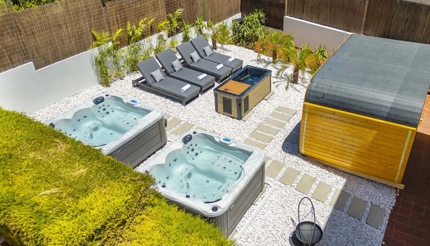 Outdoors, in addition to the heated pool (available at an additional cost), guests can enjoy a private spa area equipped with two jacuzzis (available at an additional cost), a sauna, and an ice bath (available at an additional cost), perfect for unwinding after a day in the sun.