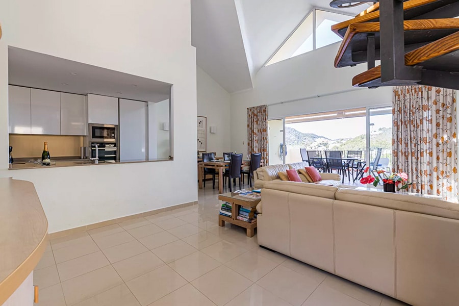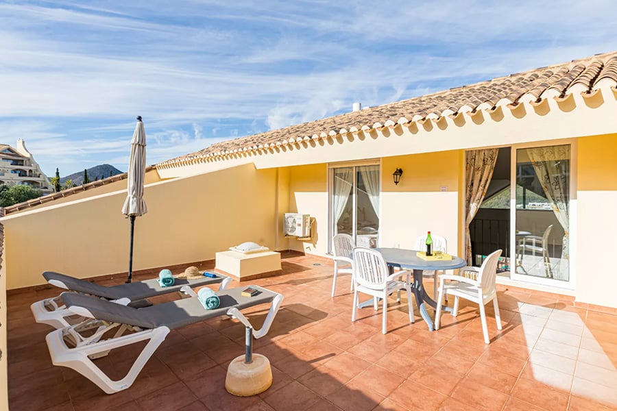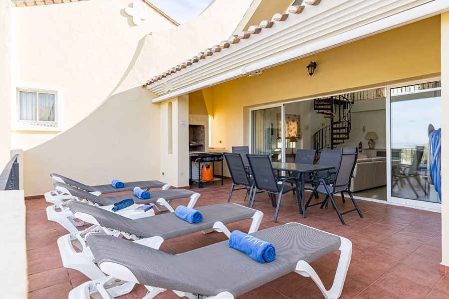 The spacious lounge and dining room has a double height ceiling which gives an extremely light and airy feel. It has satellite or cable TV and has patio doors leading to a large terrace with beautiful views. A table and chairs and a gas barbecue are available for you to enjoy al fresco dining, or just relax on the sun loungers.