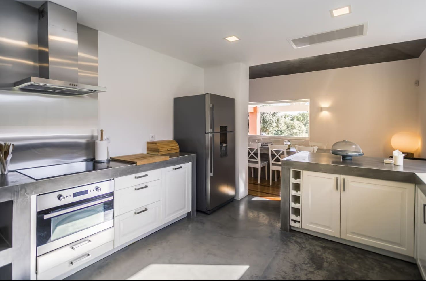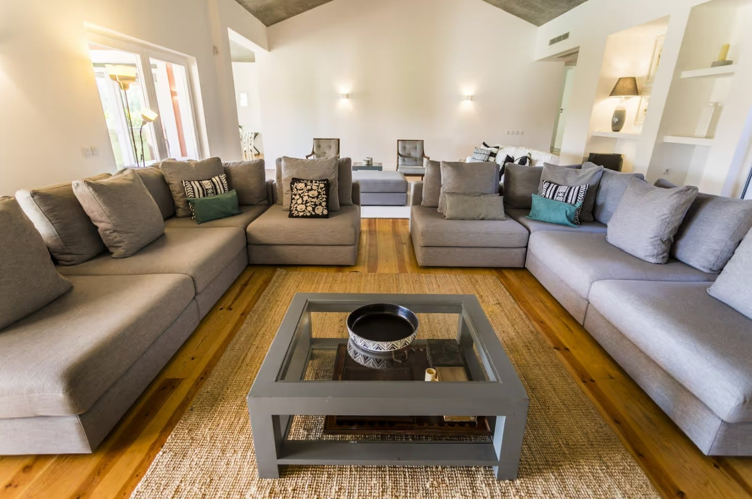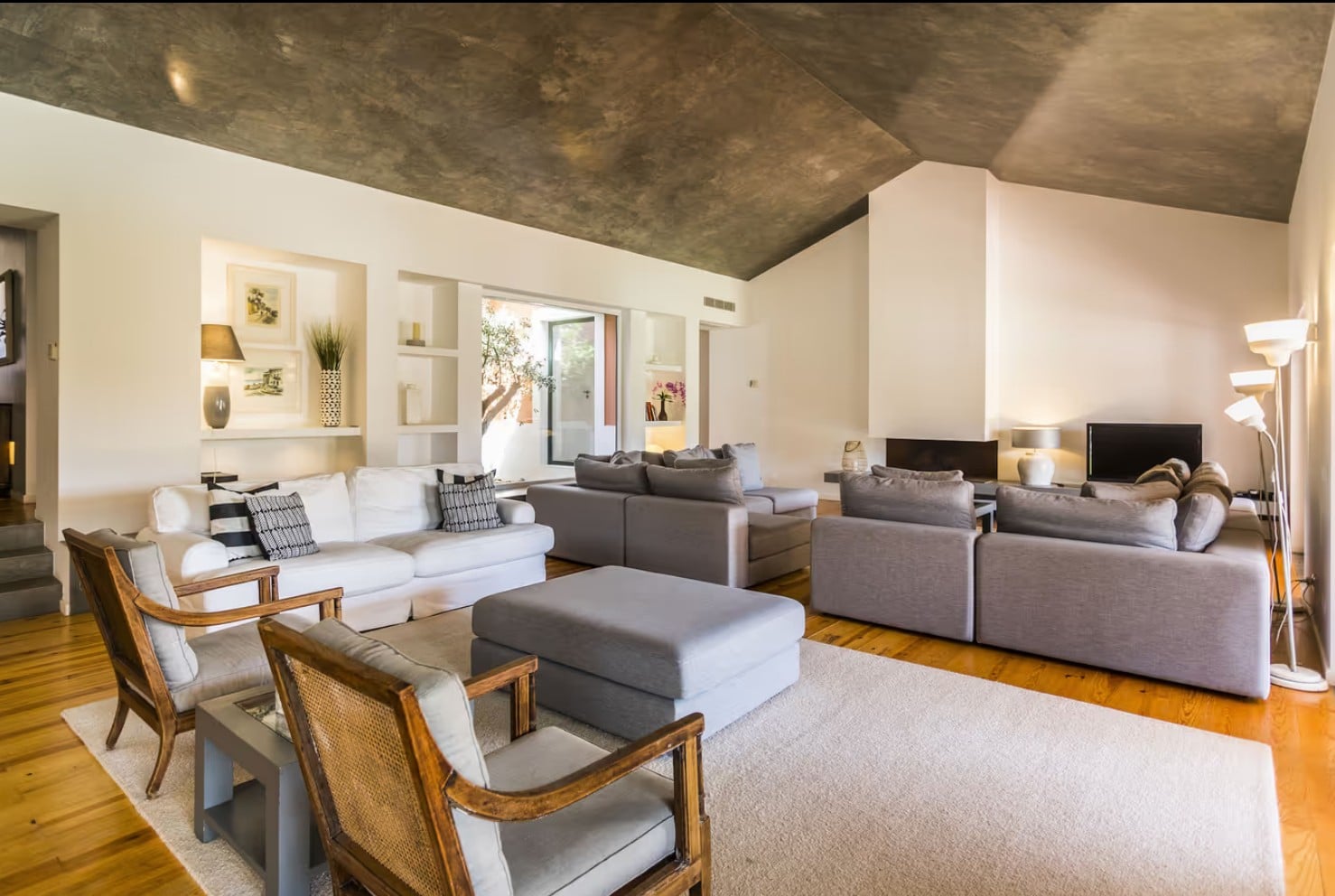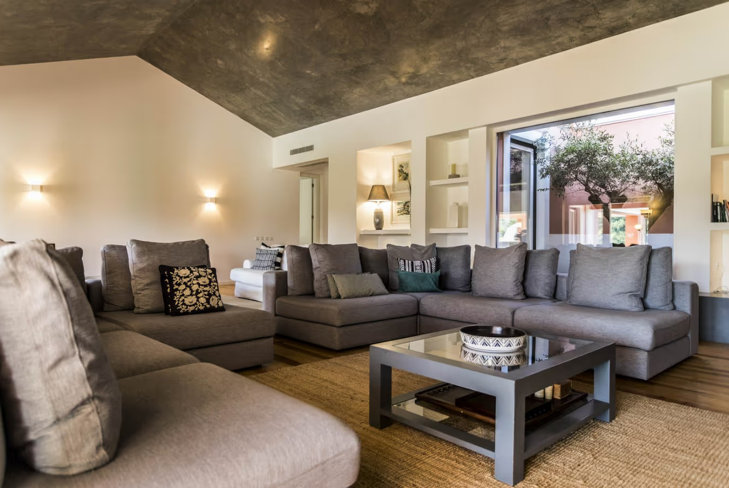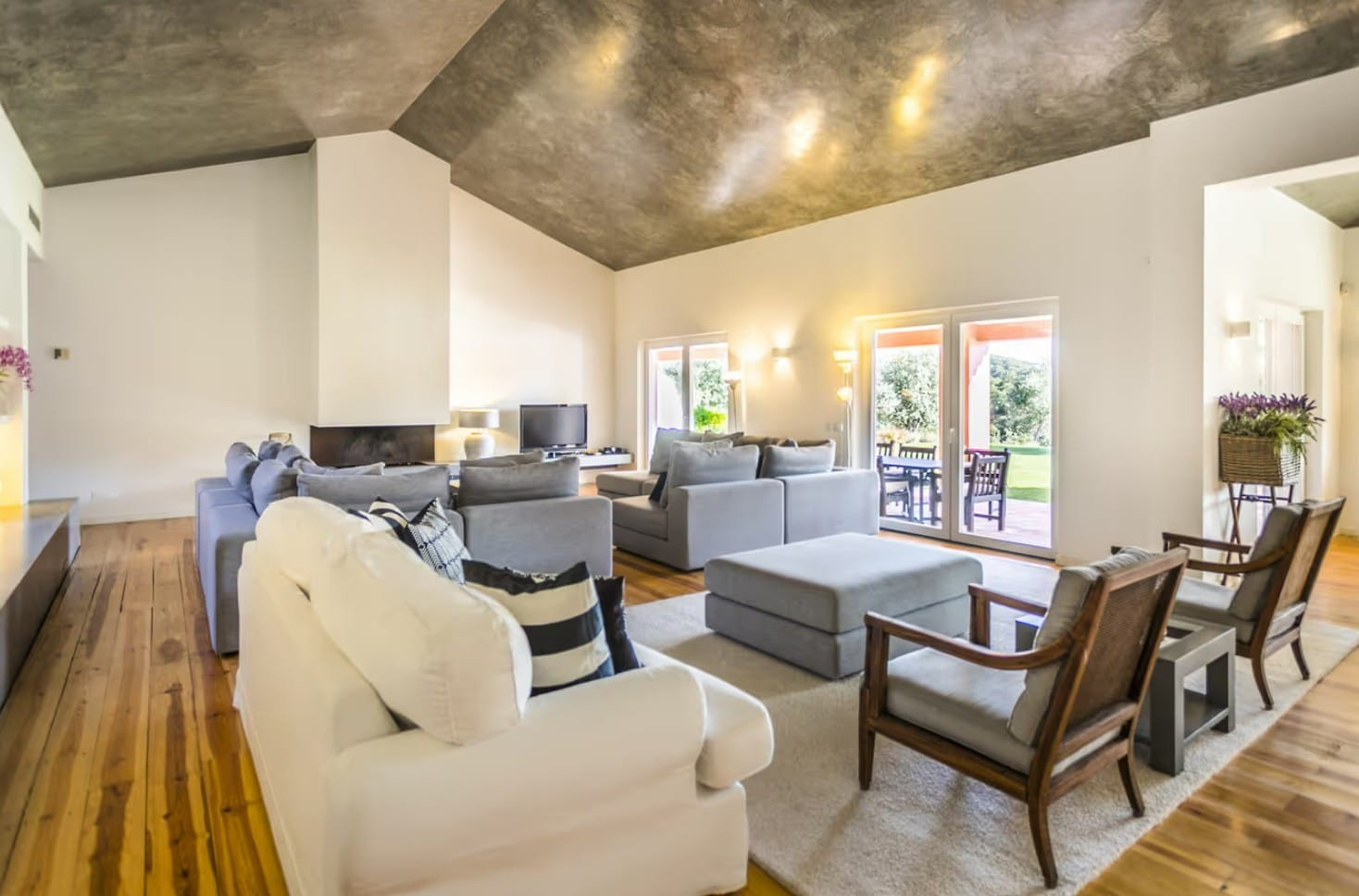 The main indoor living area is a large open-plan space with tons of room for sofas and a flat-screen TV, with huge sliding doors leading out onto the terrace and letting light into the house all day long.