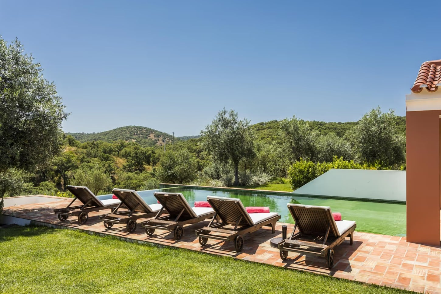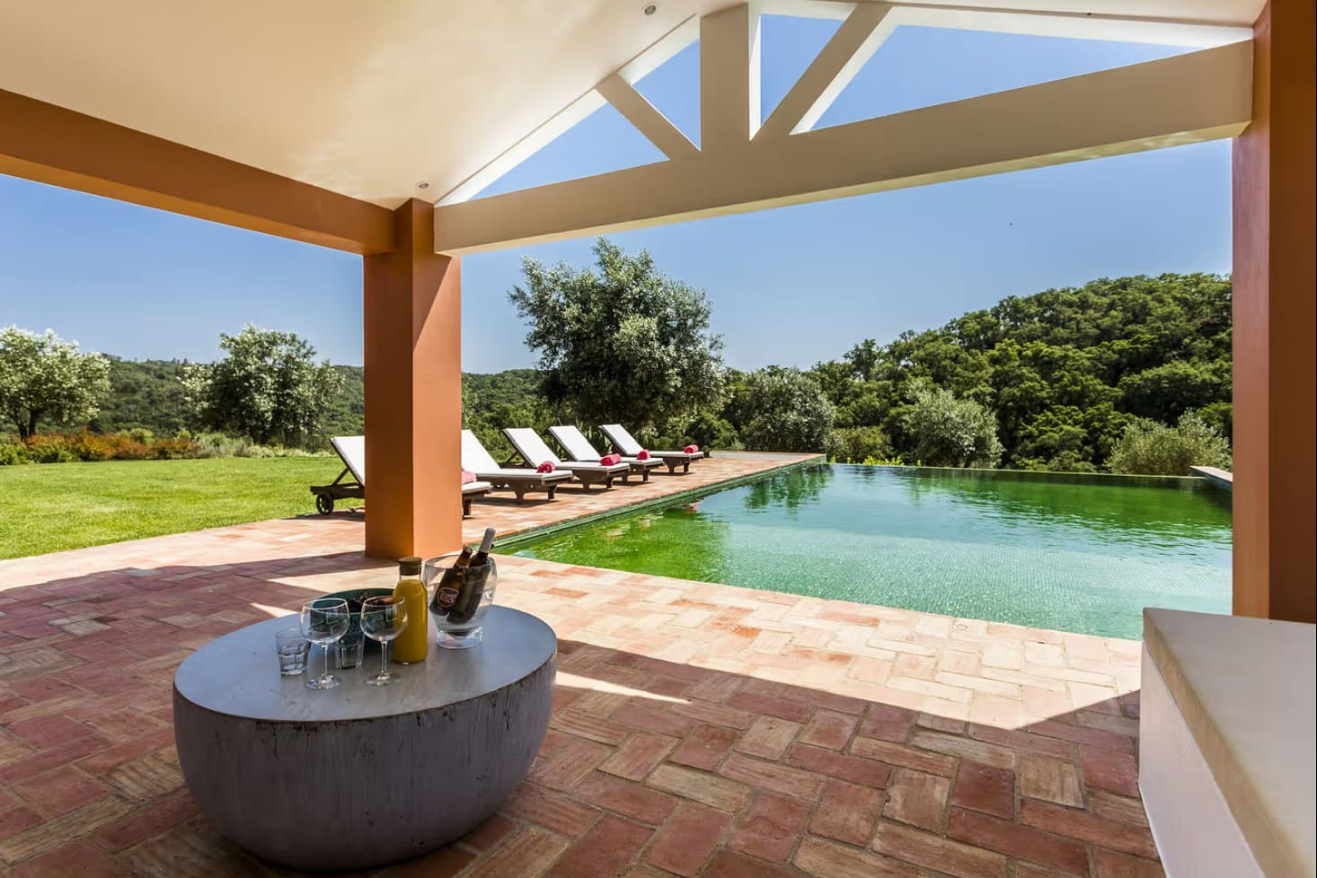 The outdoor area of Grandola Mountain Paradise is absolutely stunning, with a large infinity pool surrounded by the vibrant greens of the Grandola countryside.