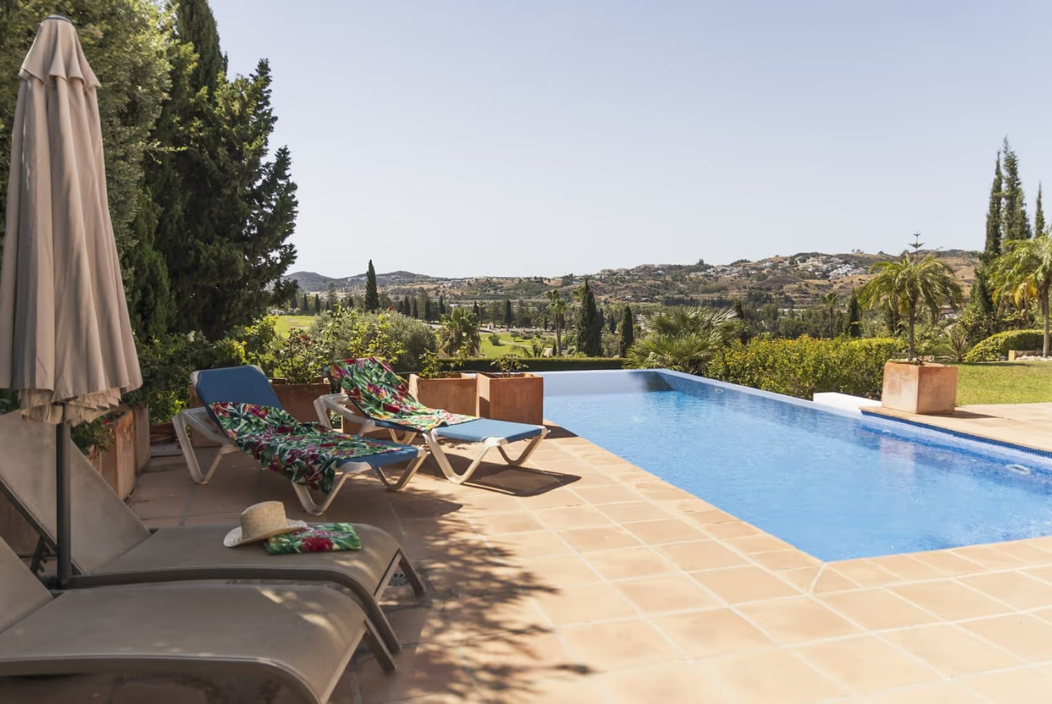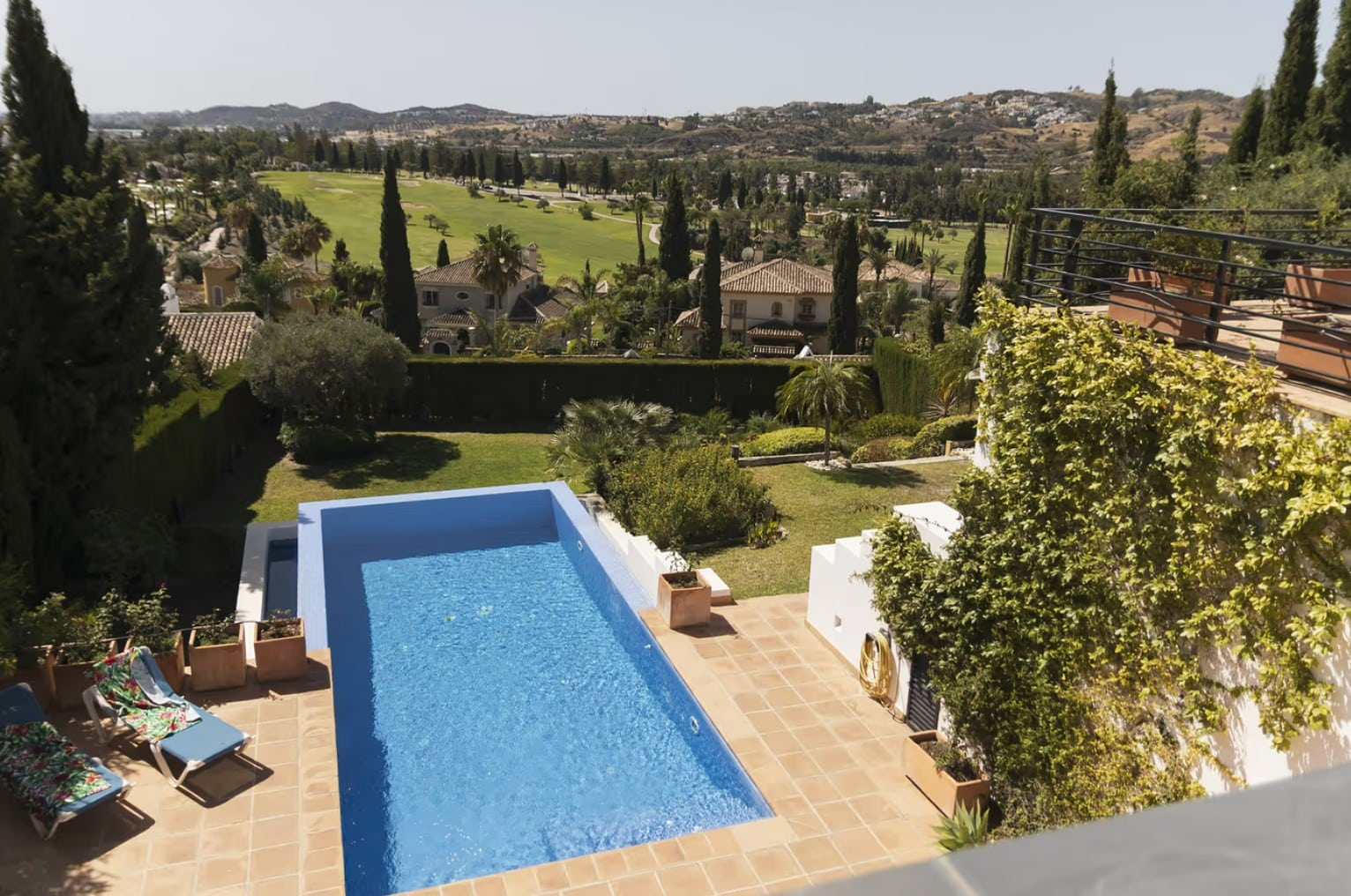 Bedrooms: 5 – Bathrooms: 5 + 1 toilet – Terrace/Balcony: 3 terraces – Capacity: Up to 10 guests – Located in Mijas Golf with views of its beautiful course. – 2-story villa. 2 living rooms.