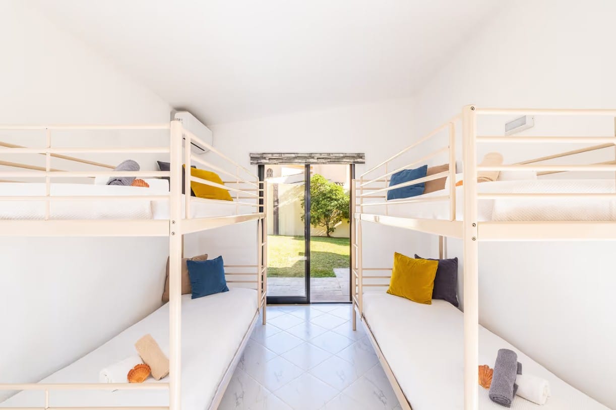 On the ground floor, there are four bedrooms: one with two sets of bunk beds and a private bathroom, a twin bedroom also with a private bathroom, and two additional twin bedrooms.